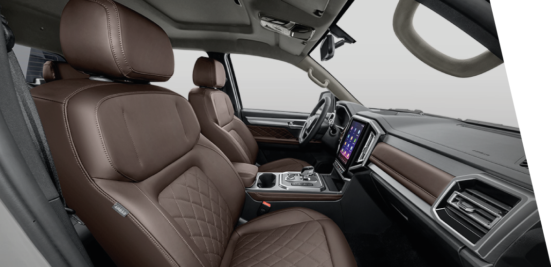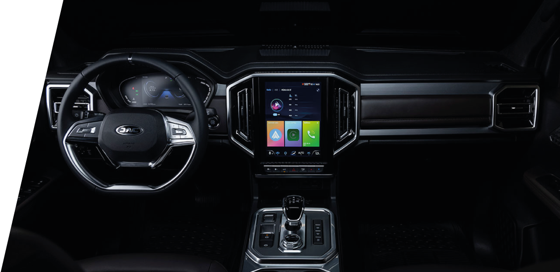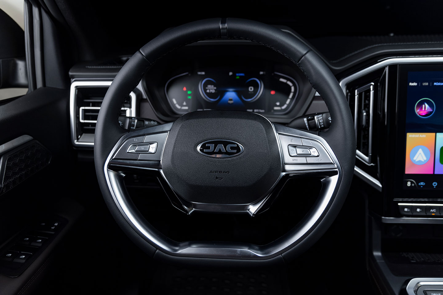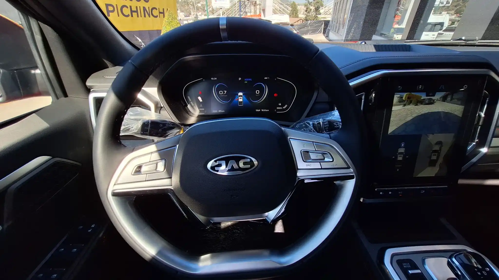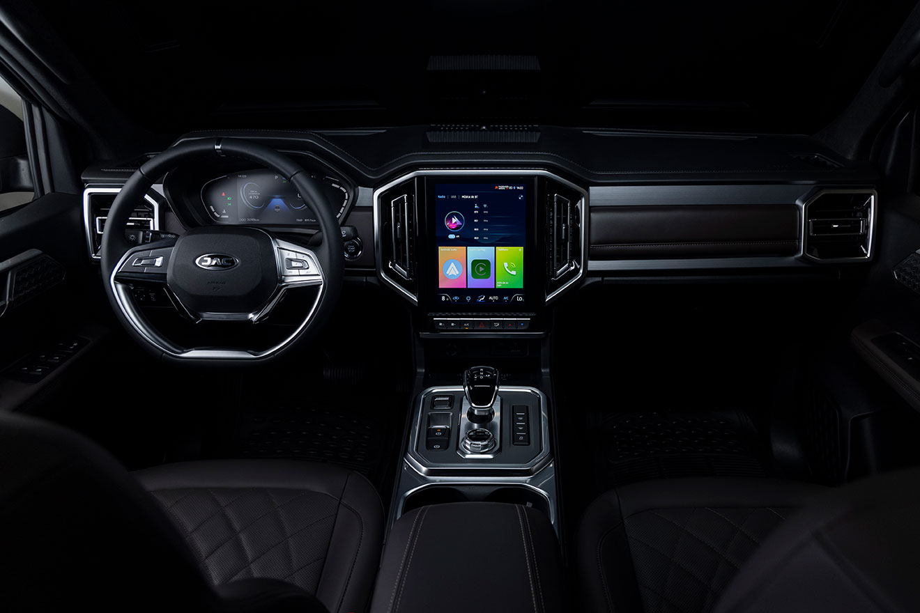El interior del JAC T9 Frison Diésel redefine el concepto de comodidad en una pick-up. Su cabina de alta gama cuenta con asientos de cuero con ajuste eléctrico, climatizador con salidas traseras, techo solar (sunroof) y un diseño envolvente que combina materiales de primera calidad con una distribución ergonómica. El conductor disfruta de un entorno sofisticado, reforzado por el tablero digital LED de 7”, botón de encendido, llave inteligente con sensor de proximidad y volante multifunción.
