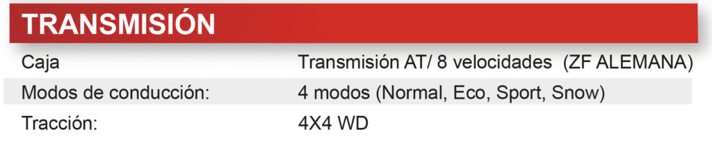 Lo acompaña una transmisión automática ZF alemana de 8 velocidades, reconocida mundialmente por su suavidad, precisión y durabilidad. Junto a un sistema de tracción 4×4 inteligente con selector de modos de conducción (Normal, Eco, Sport y Snow), el T9 Frison se adapta a cualquier terreno y estilo de manejo. Su capacidad de carga de 1 tonelada y un tanque de 20,9 galones le permiten rendir al máximo en largas distancias sin comprometer desempeño ni confort.
